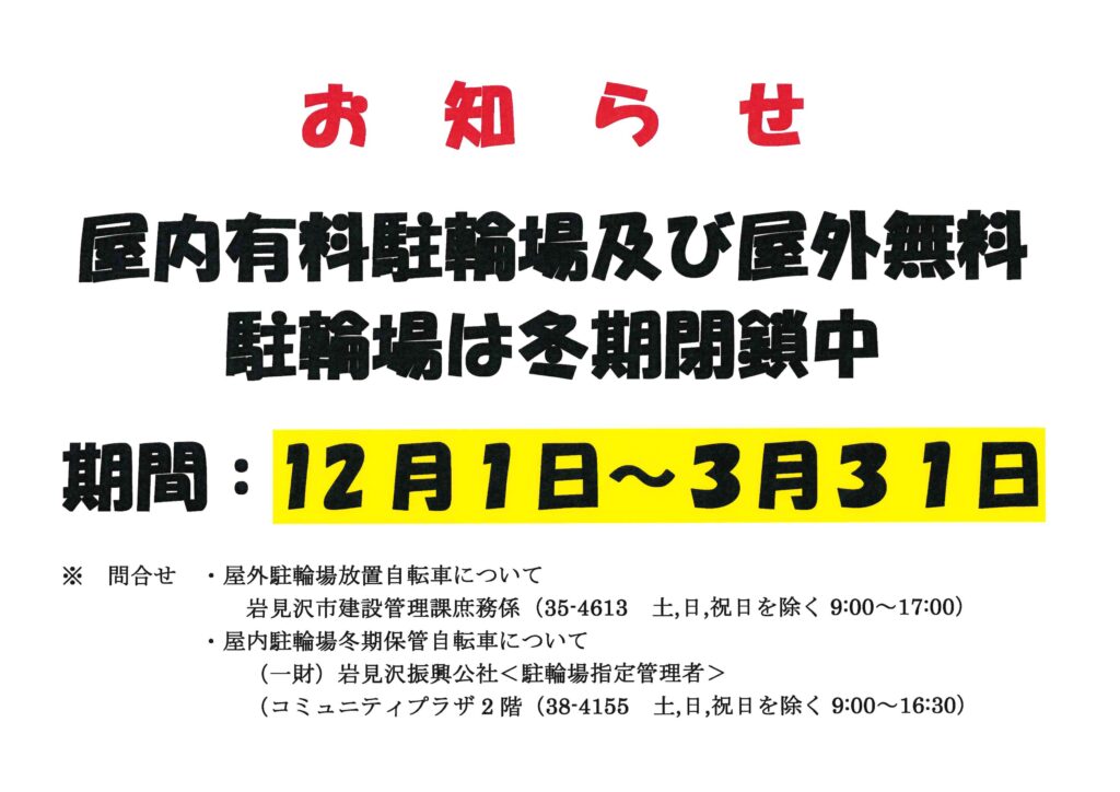 屋内駐輪場、屋外駐輪場とも3月31日まで冬期閉鎖です!!